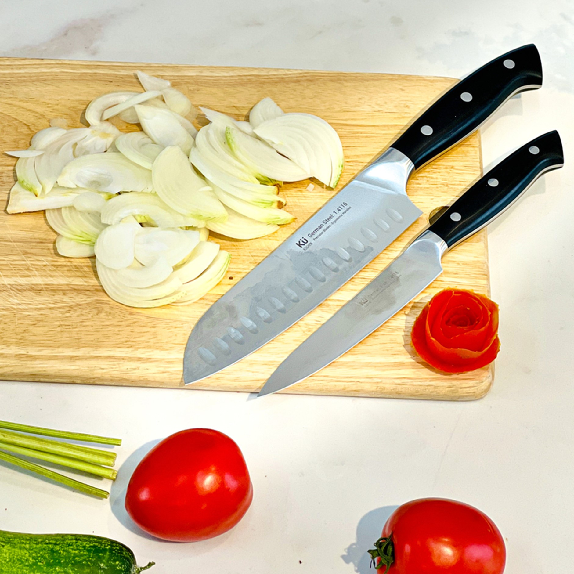 - 1 Dao Santoku (Santoku Knife): Lưỡi dao dày dày 2,5mm. Santoku là con dao được sử dụng thường xuyên nhất trong nhà bếp nhờ thiết kế mỏng nhẹ, sắc bén, hoàn hảo để cắt, thái nhiều loại thực phẩm. Dao Santoku là loại dao đa năng kiểu Nhật, rất phổ biến trong nhà bếp nhờ thiết kế độc đáo với lưỡi dao thẳng và đầu dao hơi bo tròn. Thiết kế rãnh chống dính trên lưỡi giúp giảm độ bám dính thực phẩm khi thái lát. Từ "Santoku" trong tiếng Nhật có nghĩa là "ba công dụng", ám chỉ khả năng xuất sắc của dao trong thái, cắt lát, và băm nhỏ.