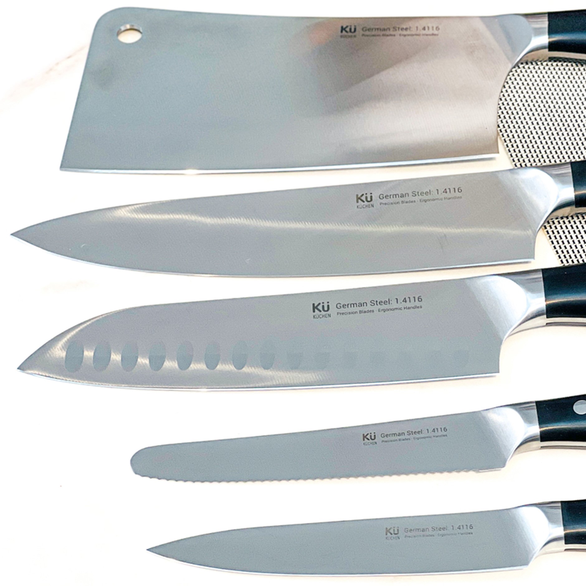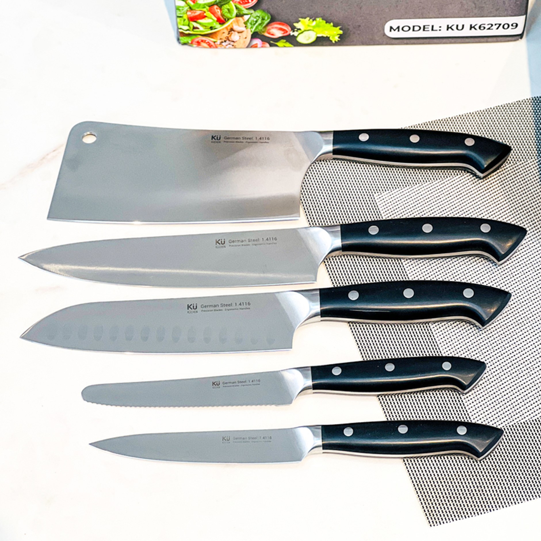 Bộ dao 6 món KÜCHEN đáp ứng mọi nhu cầu trong gian bếp, từ chặt, thái lát, lạng mỏng, cắt khúc, chia khối, lọc mỏng đến băm nhỏ, giúp việc sơ chế thực phẩm trở nên dễ dàng và tiết kiệm thời gian, công sức - Chất liệu lưỡi dao: