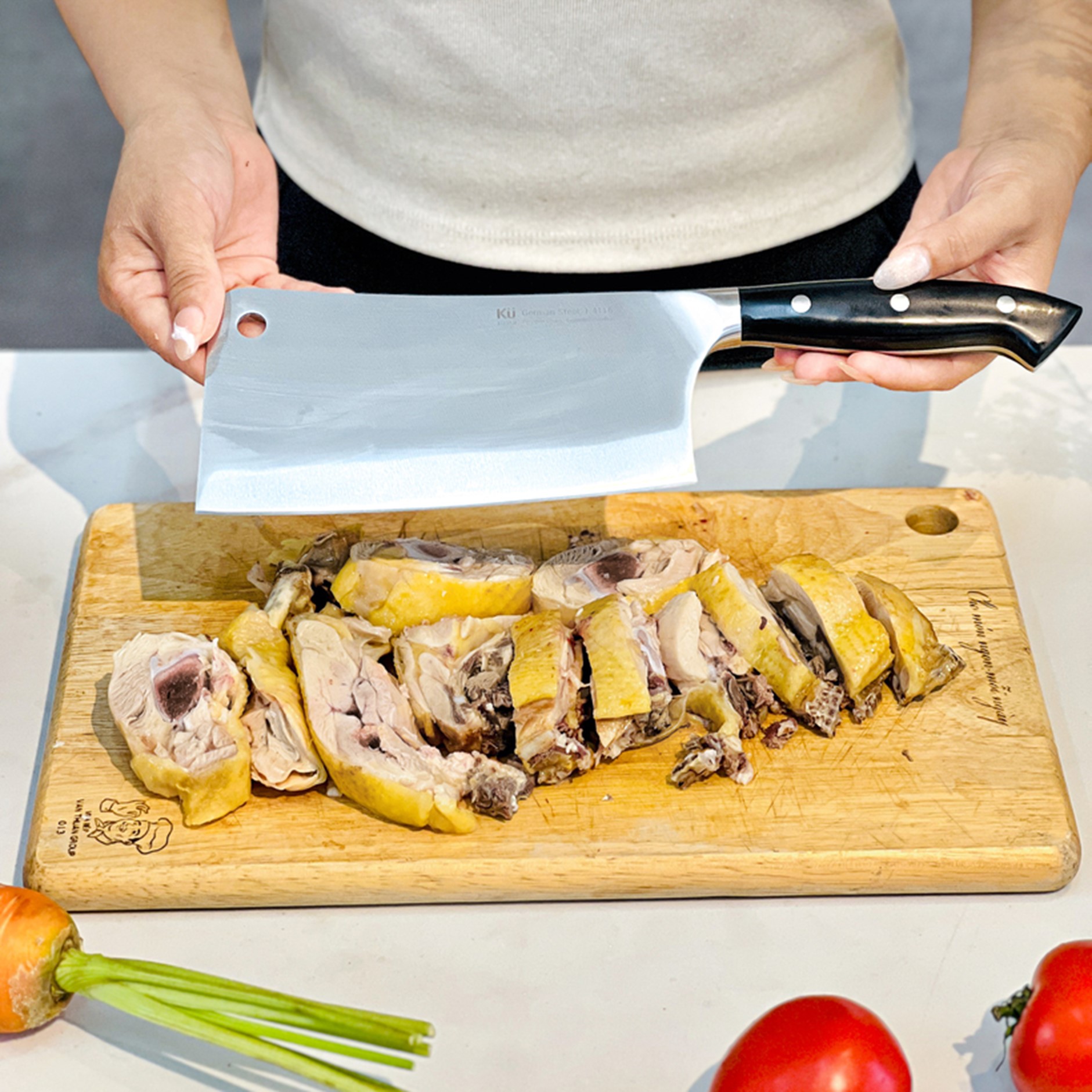 - 1 Dao chặt (Chopper Knife): Lưỡi dao 6,75 inch, dày 3 mm. Đây là loại dao có bản to, dày và nặng, chuyên dùng cho các công việc nặng trong nhà bếp như chặt và băm thịt, cắt thái rau củ lớn.