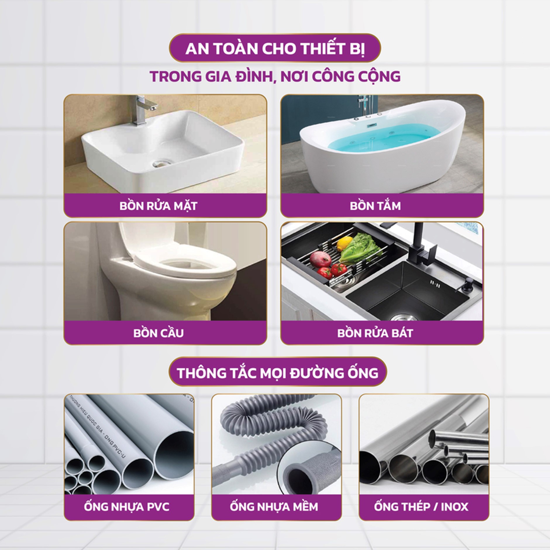 - Đặc biệt với công thức độc đáo bột thông cống hoàn toàn không gây hư hại tới hệ thống đường ống đang sử dụng. Thích hợp với mọi đường ống thoát nước như: Bồn rửa mặt, bồn rửa bát, bồn cầu, thoát sàn,… và được sử dụng mọi nơi như: Gia đình, trường học, nhà hàng, bệnh viện.