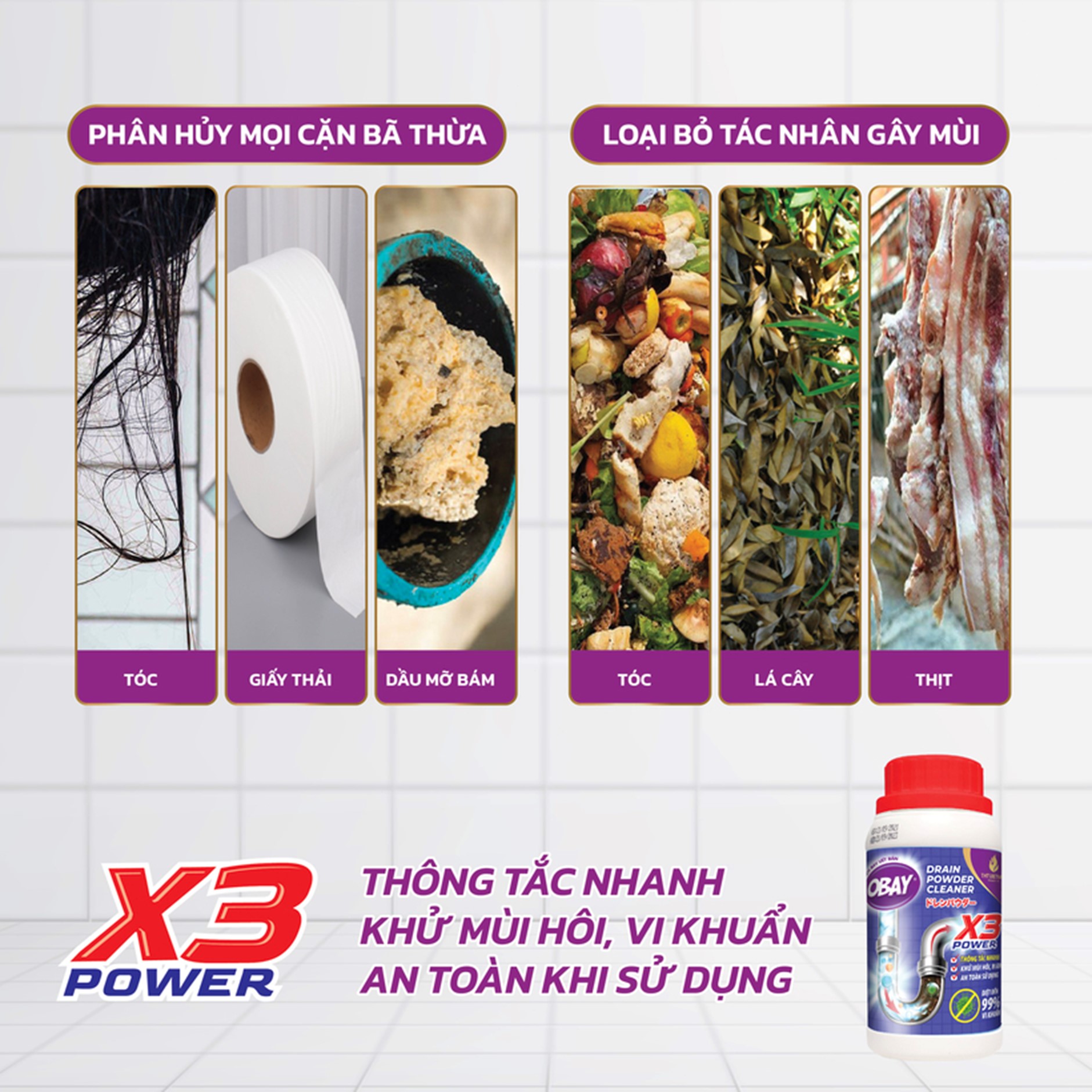2. Công dụng: Bột thông tắc cống OBAY với công nghệ thủy phân mang lại bộ 3 sức mạnh ưu việt
