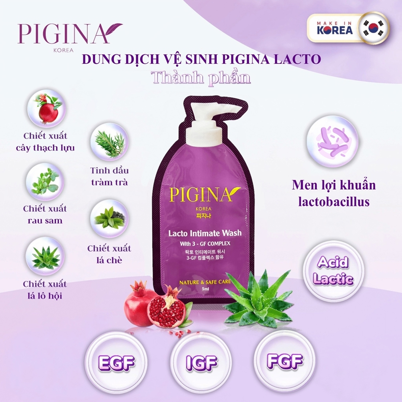 Chiết xuất từ thảo dược thiên nhiên giàu dinh dưỡng và chất chống oxy hóa, lactobacillus, cùng công nghệ tái tạo tế bào 3-GF và độ pH sinh lý 3.8-4.5. Pigina là gel vệ sinh phụ nữ an toàn, dịu nhẹ và hiệu quả nhất, giúp loại bỏ sự khó chịu, đồng thời dưỡng da vùng chữ Y của bạn luôn mềm mượt mà không lo bị kích ứng.