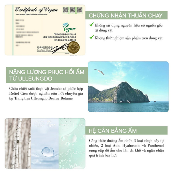 - Chứa nguồn năng lượng dưỡng ẩm từ chiết xuất thực vật Jeonho Ulluengdo cùng phức hợp Relief Cica giúp làm dịu và phục hồi da khỏi những thương tổn mạnh mẽ.