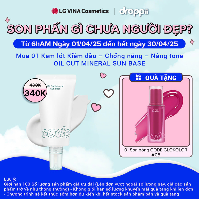 Mua 1 Kem chống nắng kiềm dầu CODE GLOKOLOR nâng tông tự nhiên, làm đều nền da, thoáng mịn, SPF 50+/PA++++ OIL CUT MINERAL SUN BASE - 35g